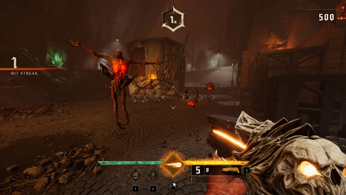 Arsenał w Metal Hellsinger nie jest bogaty, a całą grę można przejść z tą samą bronią. Mamy pistolety, strzelbę, kuszę, miecz i kilka innych broni, których nie będziemy spoilować. Niektóre z nich uderzają z dużą siłą, a inne są bardziej zgrabne lub proste. Gra zawsze zapewnia przyzwoitą ilość wrogów, i to różnych typów. Nie należy jednak oczekiwać poziomu sztucznej inteligencji DOOM-a. Można jednak agresywnie ich wykańczać, podobnie jak w Doomie - podświetlana mechanika została przeniesiona z Wujka Dooma w całości. HP uzupełnimy za pomocą specjalnych zielonych kryształów, których ilość jest ograniczona.